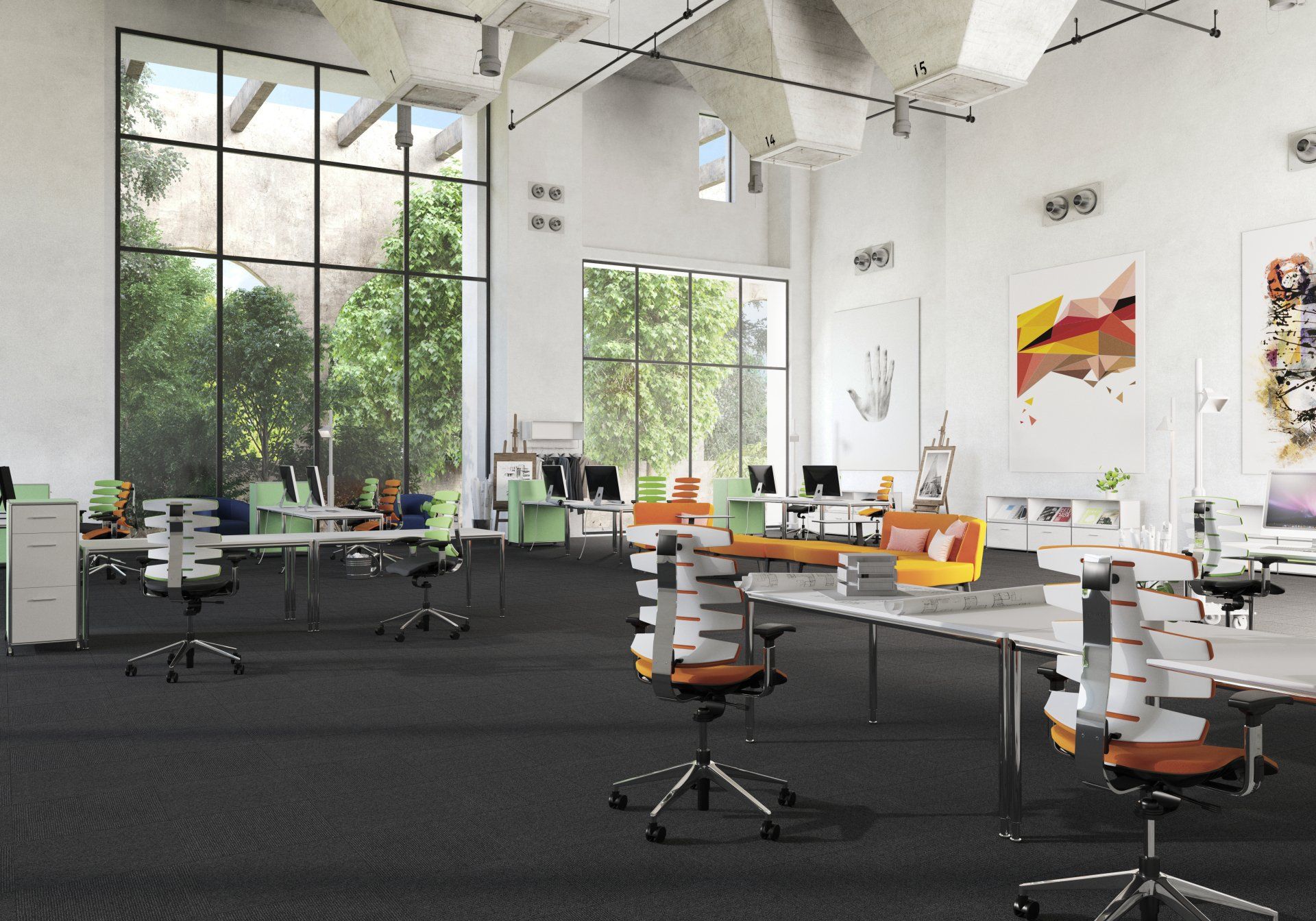 The tiles are cut directly from the wide loom rolls, thus minimizing waste and reducing the impact on the environment. Penta and Penta Stripe are produced 100% free of bitumen, PVC and latex using 100% wind energy only.